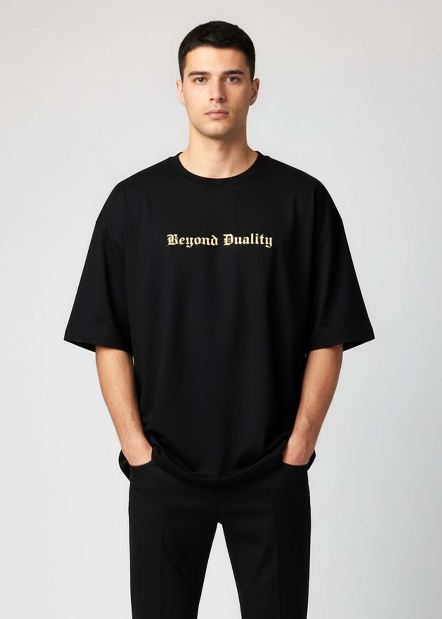 Crafted in premium heavyweight cotton with an oversized silhouette, this tee is designed to drape with authority and comfort. The deep black base allows the antique gold artwork to age gracefully, creating a piece that feels less like apparel and more like an artifact.