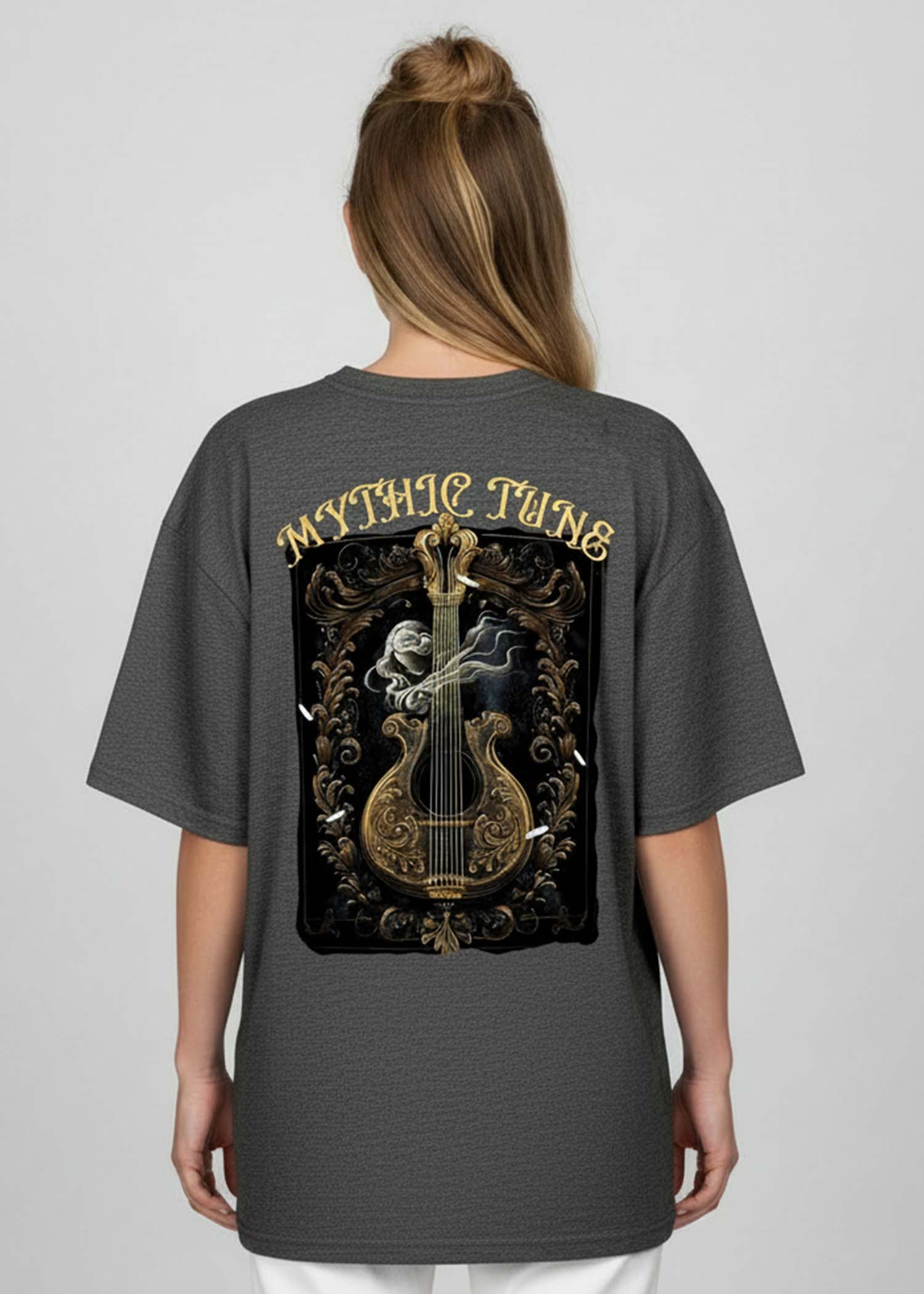 Step into the realm of Greek mythology with the Mythic Tune – The Lyre of Apollo oversized t-shirt. Crafted from 100% premium cotton, this charcoal black tee pays tribute to the divine instrument of Apollo, the god of music, poetry, and art. The front features a golden laurel wreath, a symbol of victory and wisdom, while the back showcases an intricate, baroque-style lyre design, embodying the celestial harmony of ancient Greece.